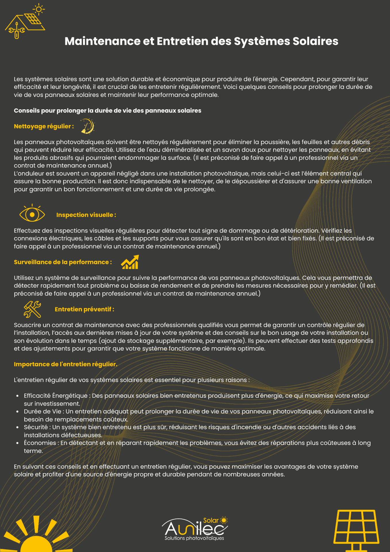 L'entretien régulier de vos systèmes solaires est essentiel pour plusieurs raisons :